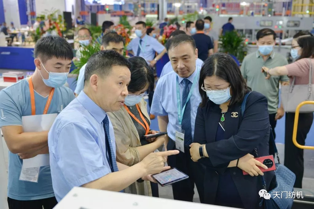2021年6月12日,在上海國際紡機展上天門紡機舉行“開創(chuàng)并條工序全自調(diào)勻整新時代”新品發(fā)布會,中紡聯(lián)黨委書記高勇使用手持終端為新產(chǎn)品開機